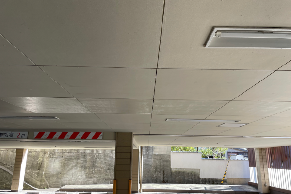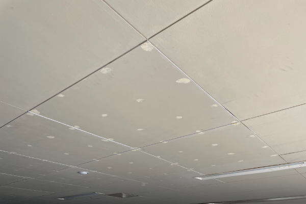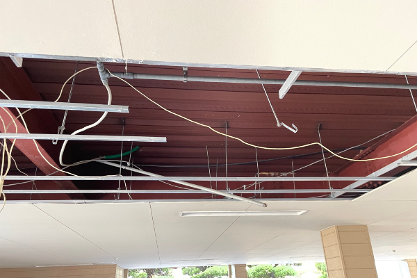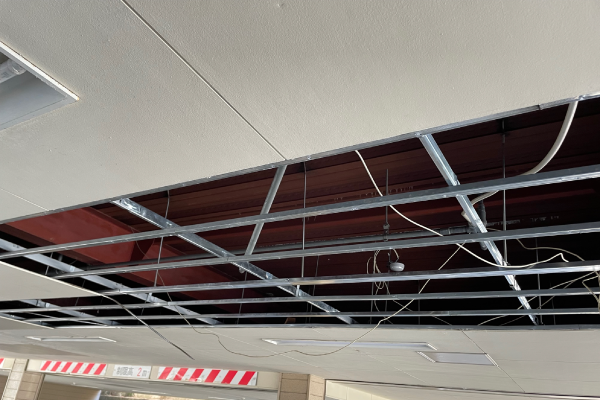 破損している軽天下地材と天井材(ケイカル板)を撤去し、下地の補強組み直しを行い、天井材の復旧を行いました。既存と類似色で塗装して工事完了です。